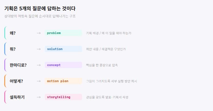 왜(why)? → 기획 배경 (problem) 뭐? → 제안 내용 (solution) 한마디로 뭐야? → 콘셉트 (concept) 그림이 안 그려져 → 실행 방안 (action plan) 당연한 얘기 지루하게 하지 말고 → 스토리텔링 (storytelling)