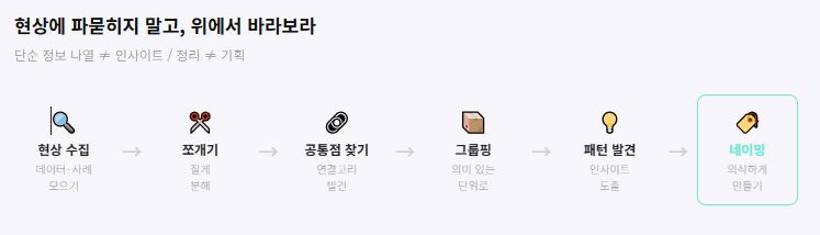 단순한 정보 나열과 인사이트의 차이, 정리와 기획의 차이가 여기서 만들어진다. '화성에서 온 남자 금성에서 온 여자'처럼, 이미 다들 겪고 있지만 의식하지 못하던 것에 이름을 붙여 의식하게 만드는 것이 기획의 힘이다.